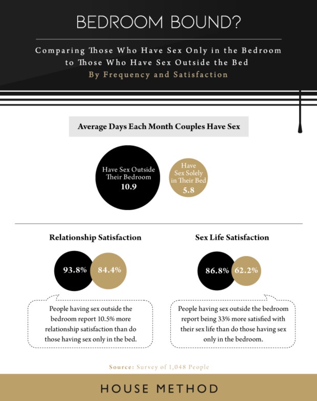 House Method surveyed 1,048 people between the ages of 18 and 80 (47 percent of which were men and 53 percent women) who are in relationships and living with their partner. They found that of those people surveyed, people who take their sex life outside of the bedroom reported 10.5 percent more relationship satisfaction than those who stayed in the bedroom. Likewise, people having sex outside the bedroom were 33 percent more likely to be satisfied with their sex life.