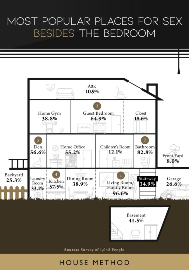 Well, some of the answers are obvious. For example, coming in at number one is the living room, with 96.6 percent of survey respondents saying they have sex there. In second place is the bathroom, where 82.8 percent of respondents admitted to getting it on… shower sex anyone? Then comes the guest bedroom at 64.9 percent. Sure, it’s still a bedroom — but at least the scenery is a little different than your own. Following the living room and guest bedroom were the kitchen and den at 57.5 and 56.6 percent, respectively.