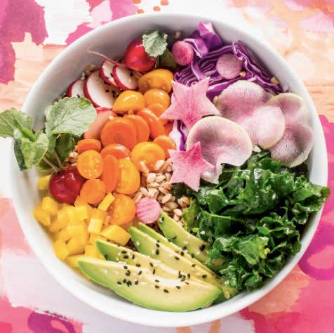 Step 3: Sprinkle the vegetables with the remaining salt. Divide the grains into two bowls and top with vegetables and edible flowers in a pretty pattern that shows off all the colorful veggies!