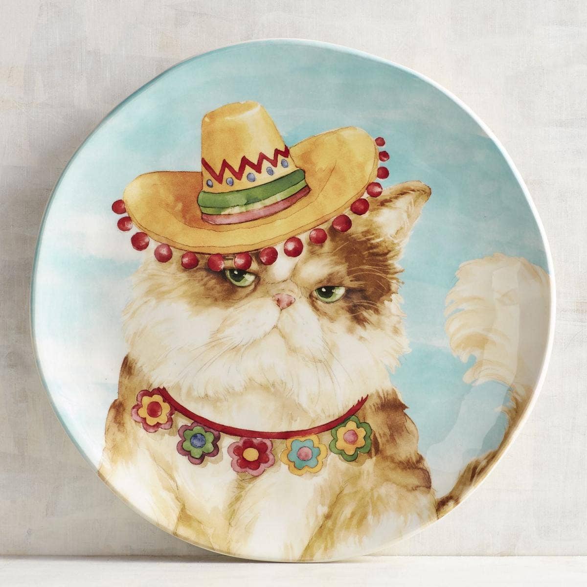 Don't be fooled by his expression — it's obvious from his outfit that this finicky feline is ready to fiesta! This whimsical ceramic salad plate pumps up the party mood when entertaining family and friends. Plates that are not just plates, but also a conversation piece are the best for a party.