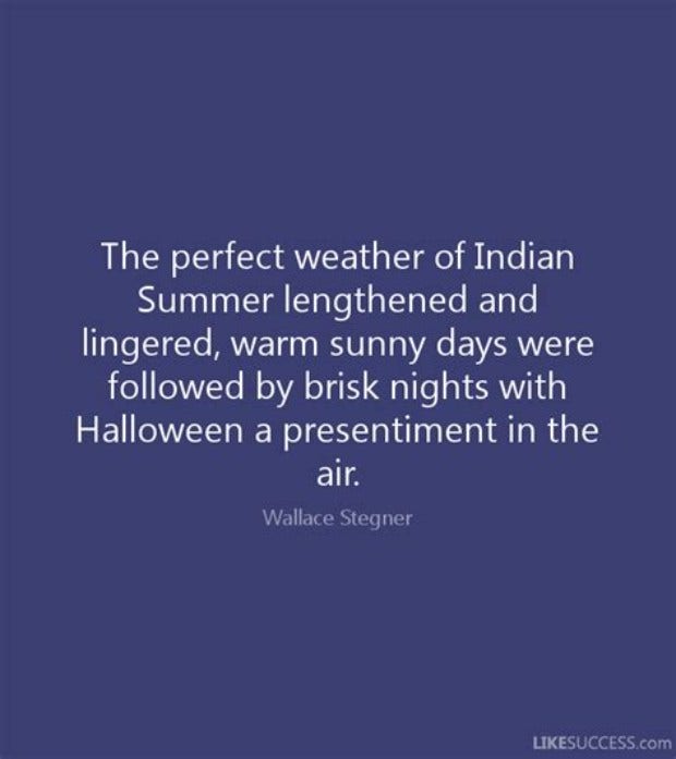 "The perfect weather of Indian summer lengthened and lingered, warm sunny days were followed by brisk nights with Halloween a presentiment in the air." -Wallace Stegner