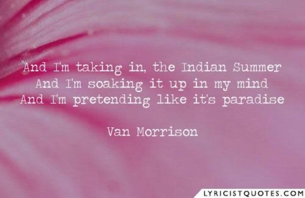 "And I'm taking in, the Indian summer. And I'm soaking it up in my mind. And I'm pretending like it's paradise" -Van Morrison