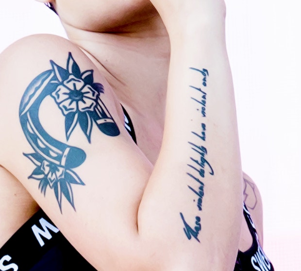 "And it doesn't mean physical violence. It more refers to excess I believe. It's like if you drink violently, it will end violently. If you love violently, it will end violently. If you do anything violently, like with too much too muchness, it's going to end poorly for you. So, it's kind of entering a world that was a whole new frontier for me, where I was being confronted with tons of new things, and tons of temptation. And then it's just kind of a reminder to keep my head in the game. This is about the music, and not all the glittery things that come with it. It's one of my favorite tattoos."