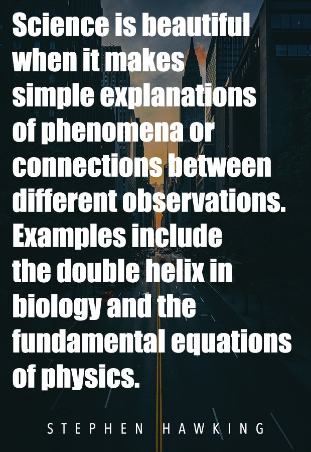 "Science is beautiful when it makes simple explanations of phenomena or connections between different observations. Examples include the double helix in biology and the fundamental equations of physics."— Stephen Hawking