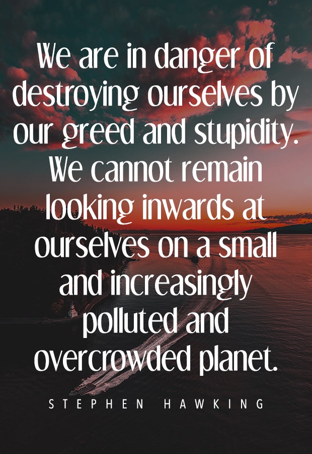 “We are in danger of destroying ourselves by our greed and stupidity. We cannot remain looking inwards at ourselves on a small and increasingly polluted and overcrowded planet.”— Stephen Hawking