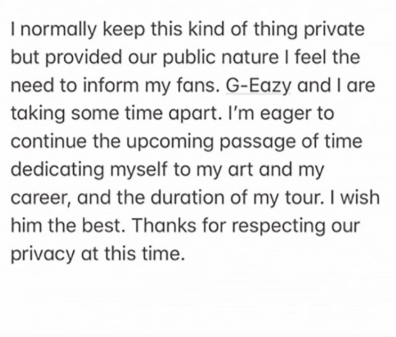 In an Instagram story, Halsey wrote, “G-Eazy and I are taking some time apart. I’m eager to continue the upcoming passage of time dedicating myself to my art and my career and the duration of my tour. I wish him the best. Thanks for respecting our privacy at this time.” Cue the waterworks.