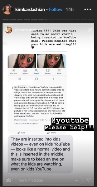 "Beware! This was just sent to me about what’s being inserted in YouTube Kids. Please monitor what your kids are watching,” Kim, 38, posted on her Instagram story Wednesday. “YouTube — please help!”