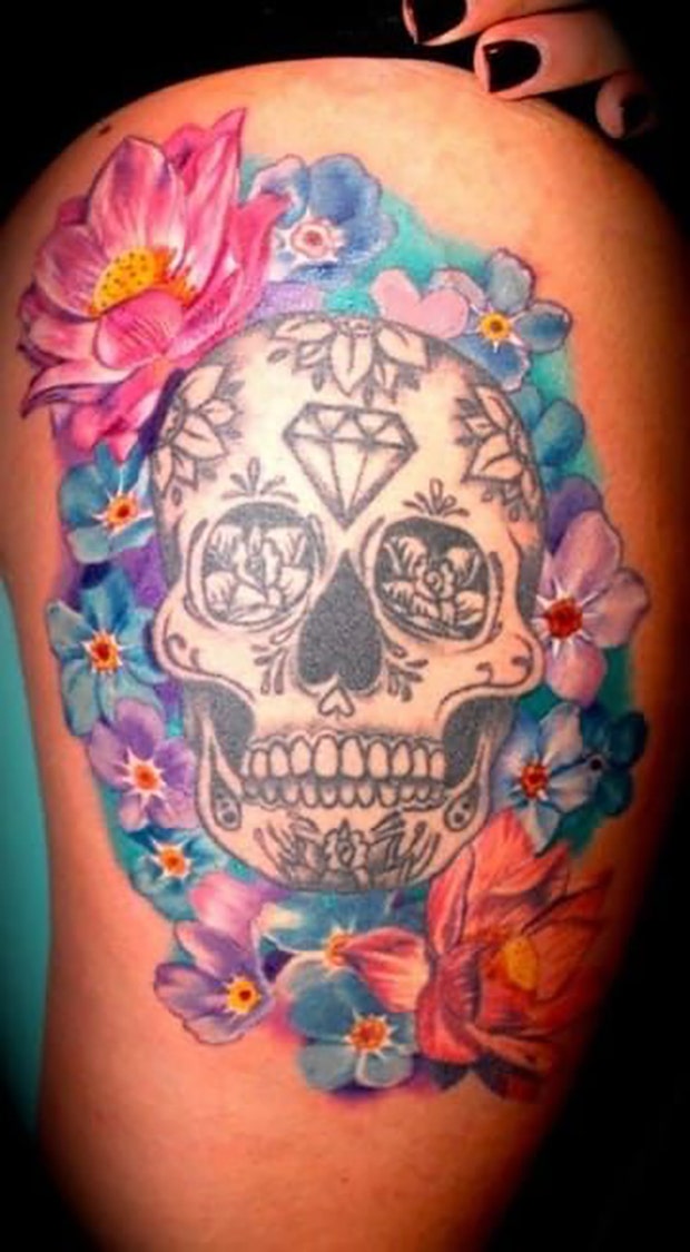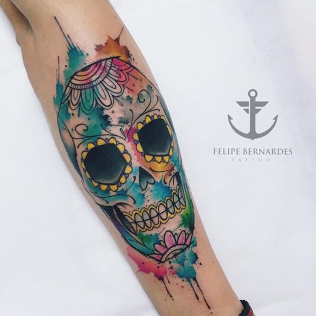47. Another sugar skull tattoo featuring watercolor.