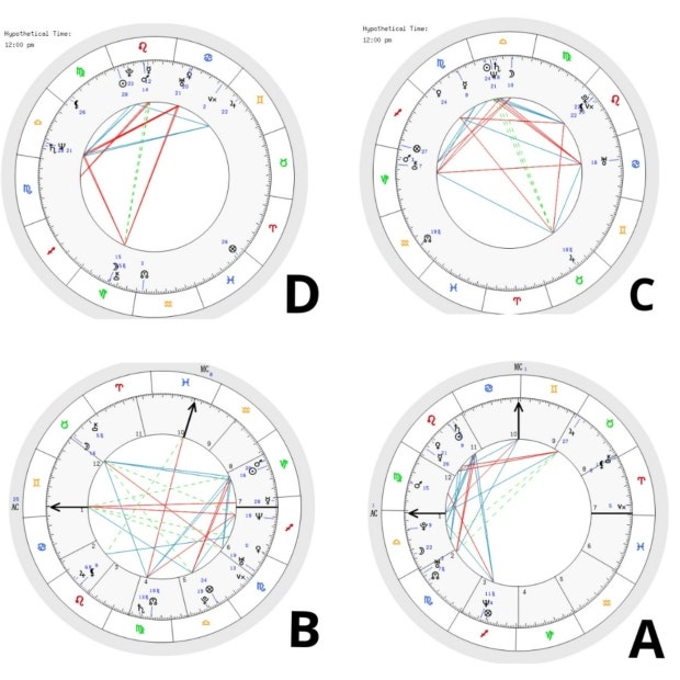 In the above chart, using my birth family as the example, my mom, chart C, is a Sun in Libra and a Moon in Libra — birth time unknown. I am represented in chart A and have a Moon in Libra and an Ascendant in Libra too.