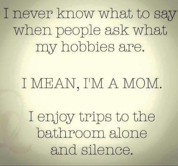 "I never know what to say when people ask what my hobbies are. I mean, I'm a mom. I enjoy trips to the bathroom alone and silence." — unknown