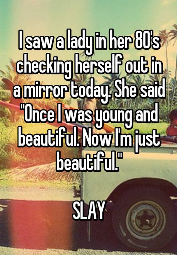 "I saw a lady in her 80's checking herself out in a mirror today. She said, 'Once I was young and beautiful. Now I'm just beautiful.' Slay." — unknown