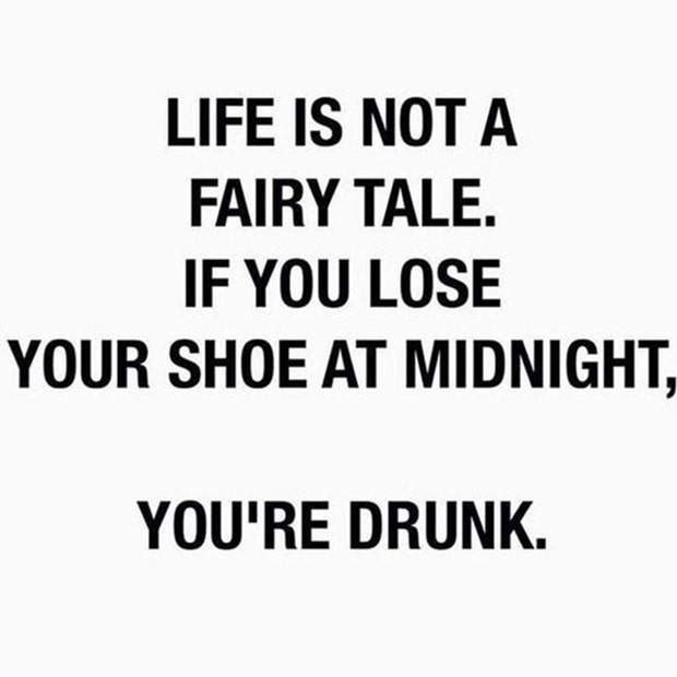 "Life is not a fairytale. If you lose your shoe at midnight, you're drunk."— unknown