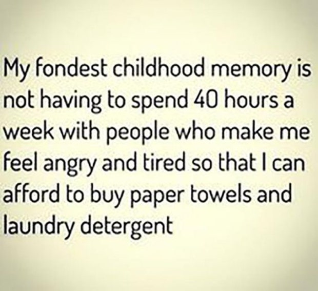 "My fondest childhood memory is not having to spend 40 hours a week with people who make me feel angry and tired, so that I can afford to buy paper towels and laundry detergent." — unknown
