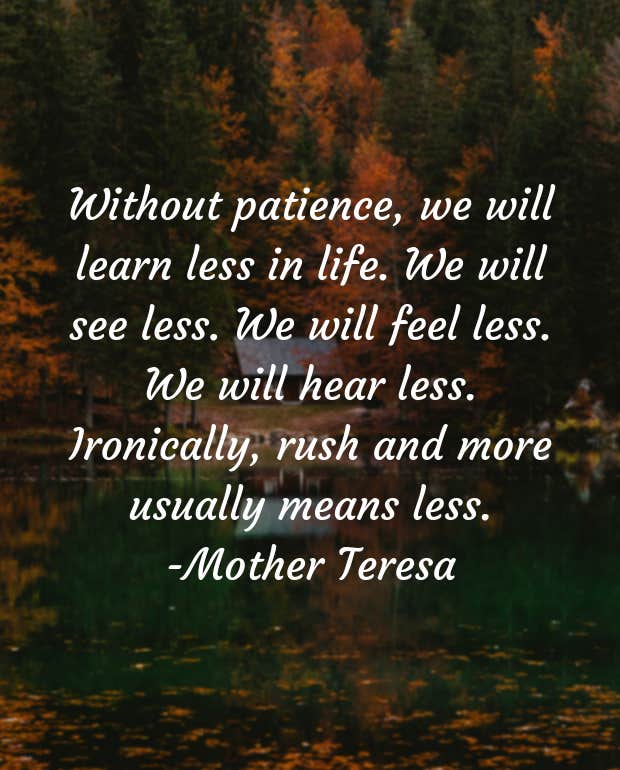 Without patience, we will learn less in life. We will see less. We will feel less. We will hear less. Ironically, rush and more usually means less. -Mother Teresa