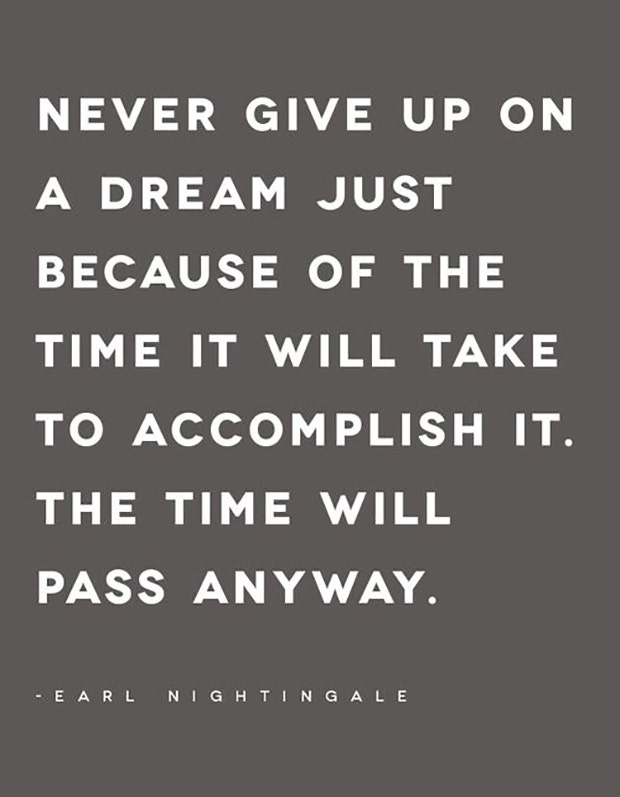 "Never give up on a dream just because of the time it will take to accomplish it. The time will pass anyway."—Earl Nightingale