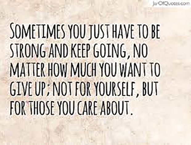 "Sometimes you just have to be strong and keep going, no matter how much you want to give up; not for yourself, but for those you care about."—Unknown