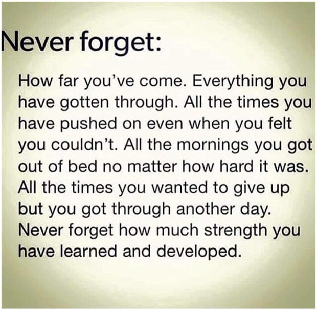 "Never forget: How far you've come. Everything you have gotten through. All the times you have pushed on even when you felt you couldn't. All the mornings you got out of bed no matter how hard it was. All the times you wanted to give up but you got through another day. Never forget how much strength you have learned and developed.—Unknown