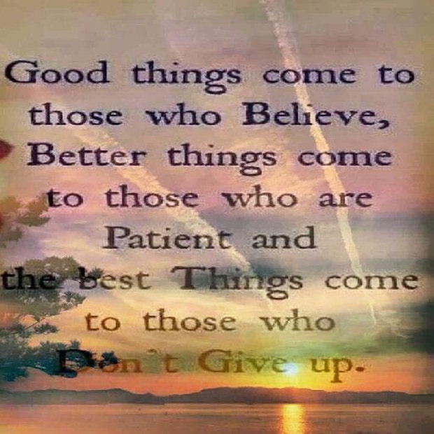 "Good things come to those who believe, better things come to those who are patient, and the best things come to those who don't give up."—Unknown