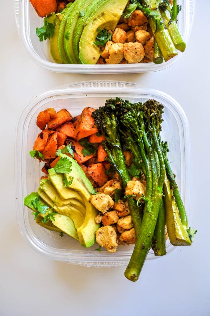 Portion the chicken, sweet potato, and broccoli into five containers. When you're ready to eat, slice up some avocado and serve.