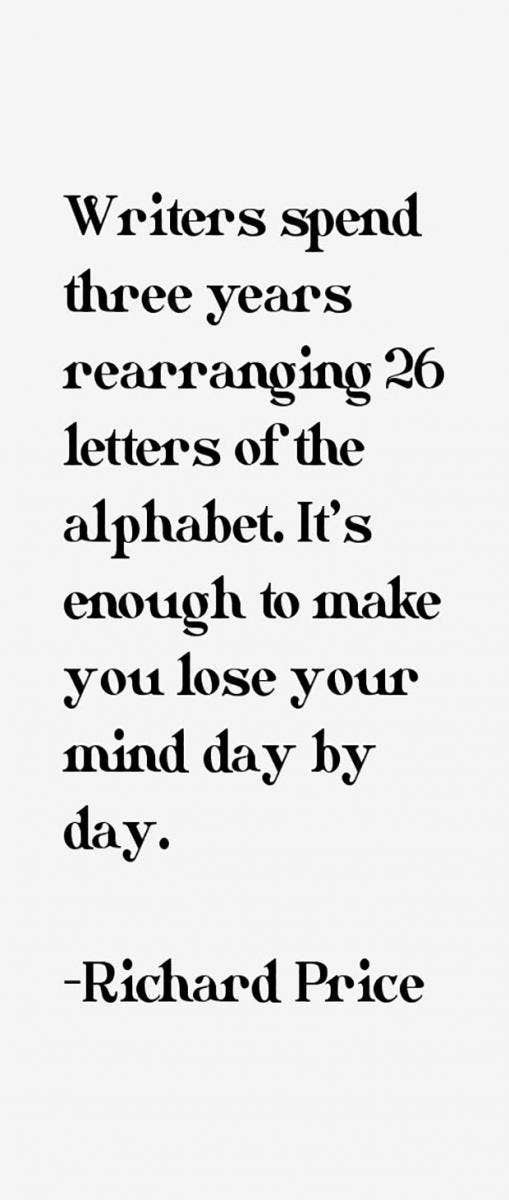 "Writers spend three years rearranging 26 letters of the alphabet. It's enough to make you lose your mind day by day." - Richard Price