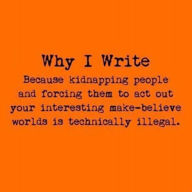 "Why I write: because kidnapping people and forcing them to act out your interesting make-believe worlds is technically illegal." - Unknown
