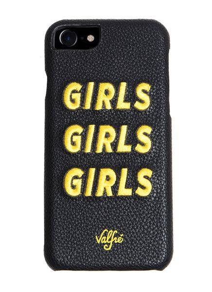 This protective, black vegan leather hardshell phone case with yellow embroidered “GIRLS GIRLS GIRLS” text is perfect for any teen girl on the go.