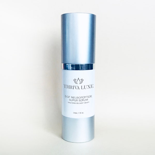 And Thrivaluxe EGF Neuropeptide Super Serum 100mg CBD Growth Factor is a multifaceted silky serum, highly concentrated with skin repairing peptides and combined with Full Spectrum Hemp Oil Compounds to minimize the appearance of expression lines and wrinkles, support thin, fragile skin, and increase elasticity as it regenerates and restructures.