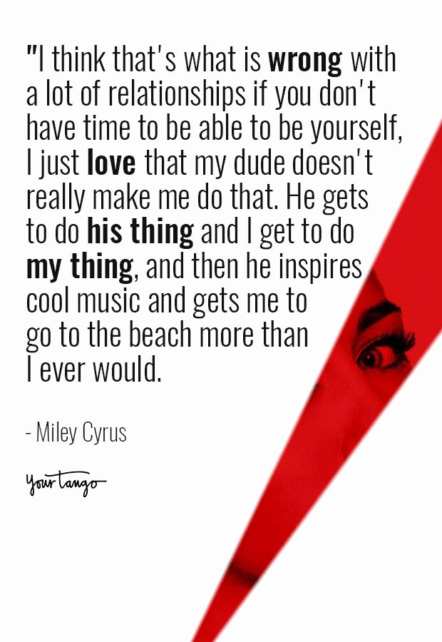 "I think that's what is wrong with a lot of relationships if you don't have time to be able to be yourself, I just love that my dude doesn't really make me do that. He gets to do his thing and I get to do my thing, and then he inspires cool music and gets me to go to the beach more than I ever would." — Miley Cyrus