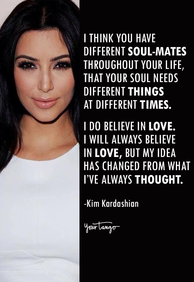 “ I think you have different soul-mates throughout your life, that your soul needs different things at different times. I do believe in love. I will always believe in love, but my idea has changed from what I've always thought," — Kim Kardashian