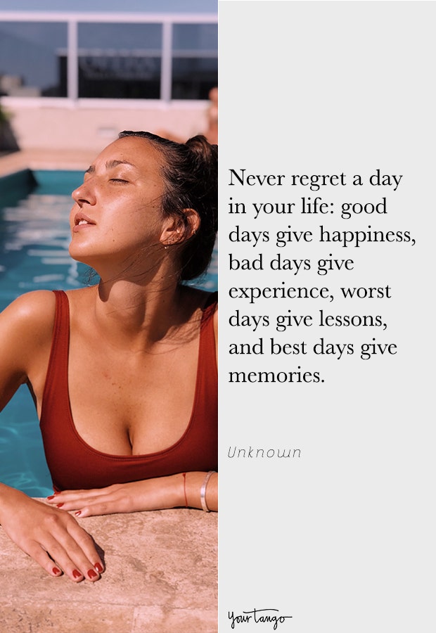 "Never regret a day in your life: good days give happiness, bad days give experience, worst days give lessons, and best days give memories." — Unknown
