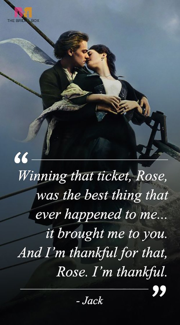"Winning that ticket, Rose, was the best thing that ever happened to me... it brought me to you. And I'm thankful for that, Rose. I'm thankful." — Jack, Titanic