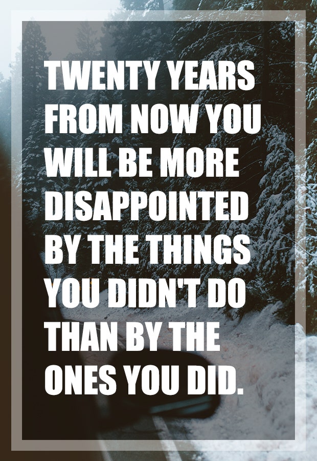 "Twenty years from now you will be more disappointed by the things you didn't do than by the ones you did. So throw off the bowlines, sail away from the safe harbor. Catch the trade winds in you sail. Explore. Dream. Discover." — Mark Twain