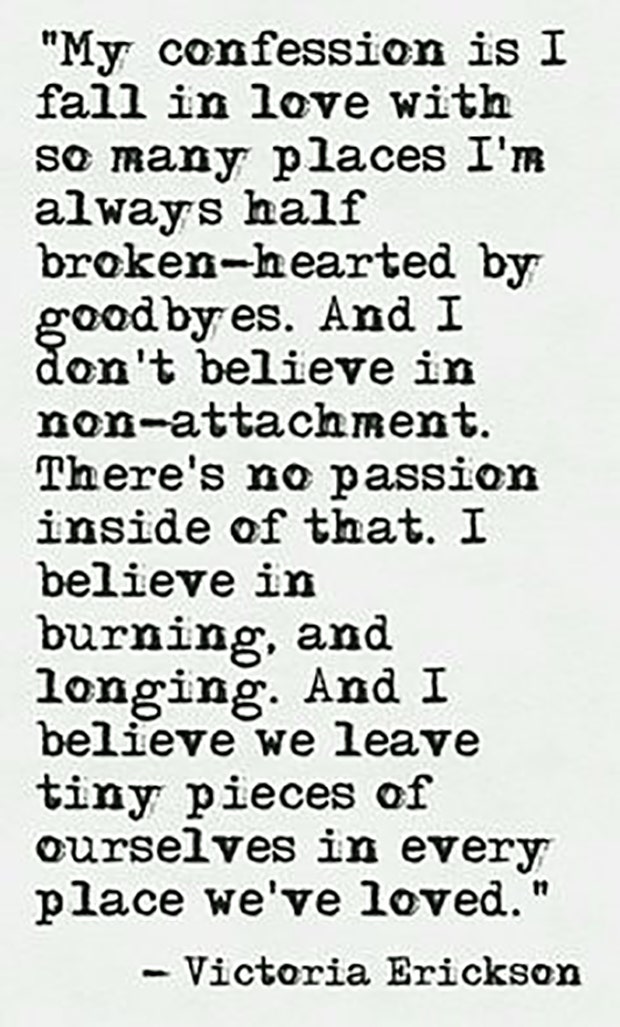 "My confession is I fall in love with so many places I'm always half broken-hearted by goodbyes. And I don't believe in burning, and longing. And I believe we leave tiny pieces of ourselves in every place we've loved." — Victoria Erickson