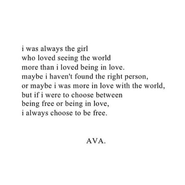 "I was always the girl who loved seeing the world more than I love being in love. Maybe I haven't found the right person. Or maybe I was more in love with the world, but if I were to choose between being free or being in love, I always choose to be free." — AVA