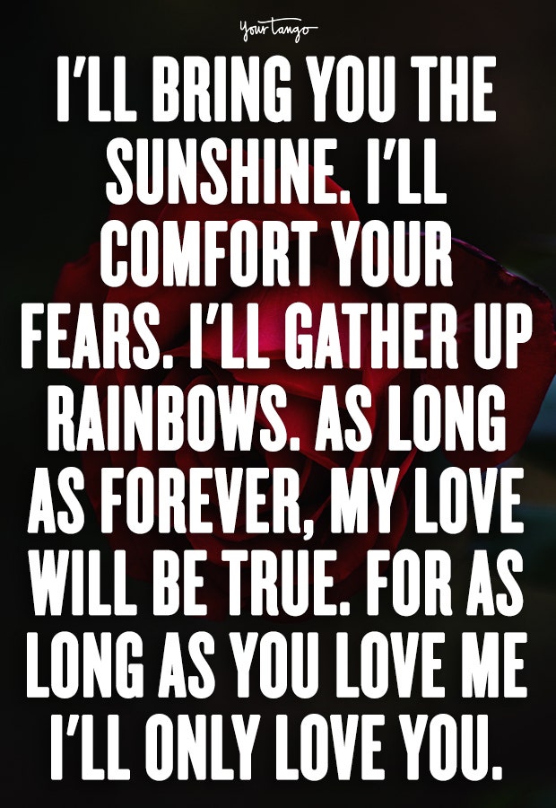 "I'll bring you the sunshine. I'll comfort your fears. I'll gather up rainbows. As long as forever, my love will be true. For as long as you love me I'll only love you." — Unknown