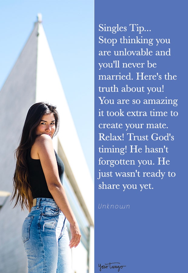 "Singles Tip...Stop thinking you are unlovable and you'll never be married. Here's the truth about you! You are so amazing it took extra time to create your mate. Relax! Trust God's timing! He hasn't forgotten you. He just wasn't ready to share you yet." — Unknown