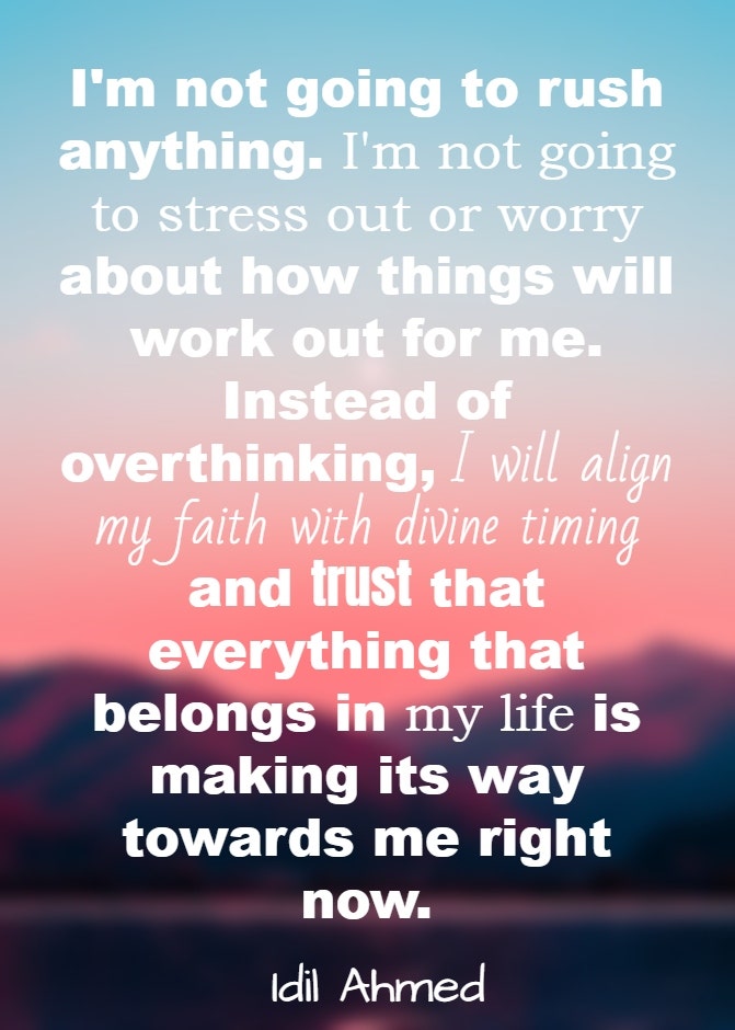 "I'm not going to rush anything. I'm not going to stress out or worry about how things will work out for me. Instead of overthinking, I will align my faith with divine timing and trust that everything that belongs in my life is making its way towards me right now." — Idil Ahmed