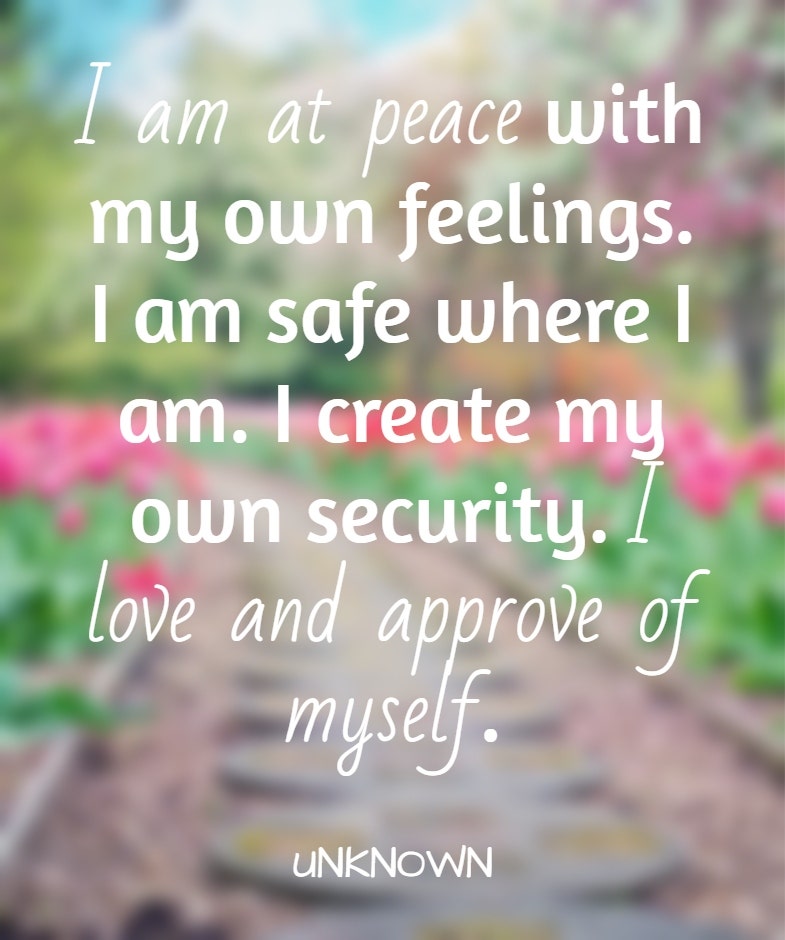 "I am at peace with my own feelings. I am safe where I am. I create my own security. I love and approve of myself." — Unknown