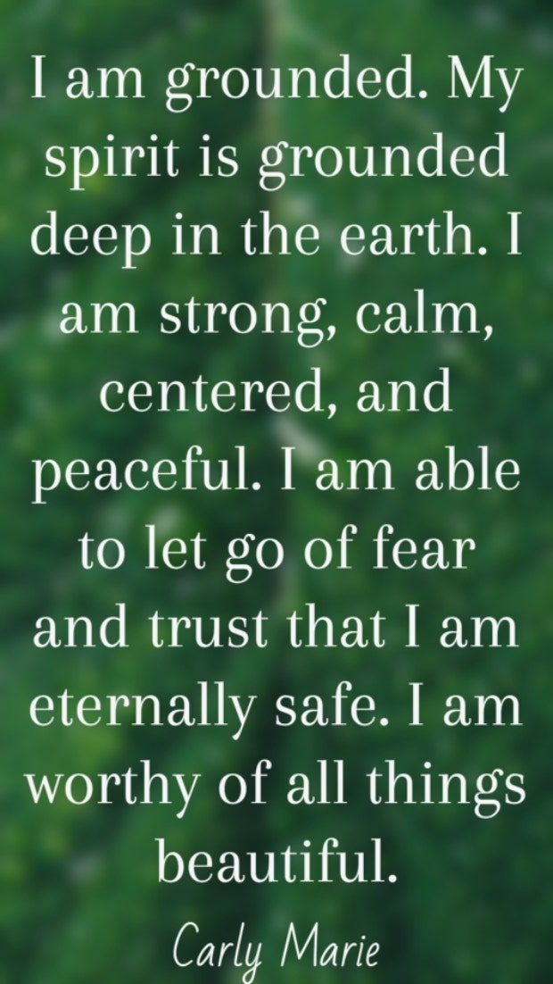 "I am grounded. My spirit is grounded deep in the earth. I am strong, calm, centered, and peaceful. I am able to let go of fear and trust that I am eternally safe. I am worthy of all things beautiful." — Carly Marie