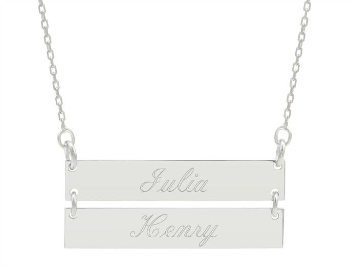 The Engravable Double Name Bar Silver Necklace makes a great engagement gift with a personal touch and ships within 24 hours of ordering. Engrave with the names of the couple for a thoughtful and unique keepsake.