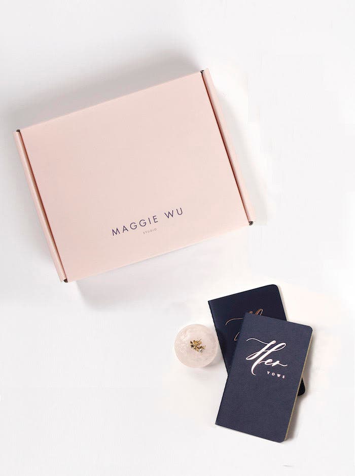 Say congratulations to the newly engaged bride who has everything. This thoughtfully curated gift set includes two Vow Books by Seniman Calligraphy, and a rose quartz ring dish.