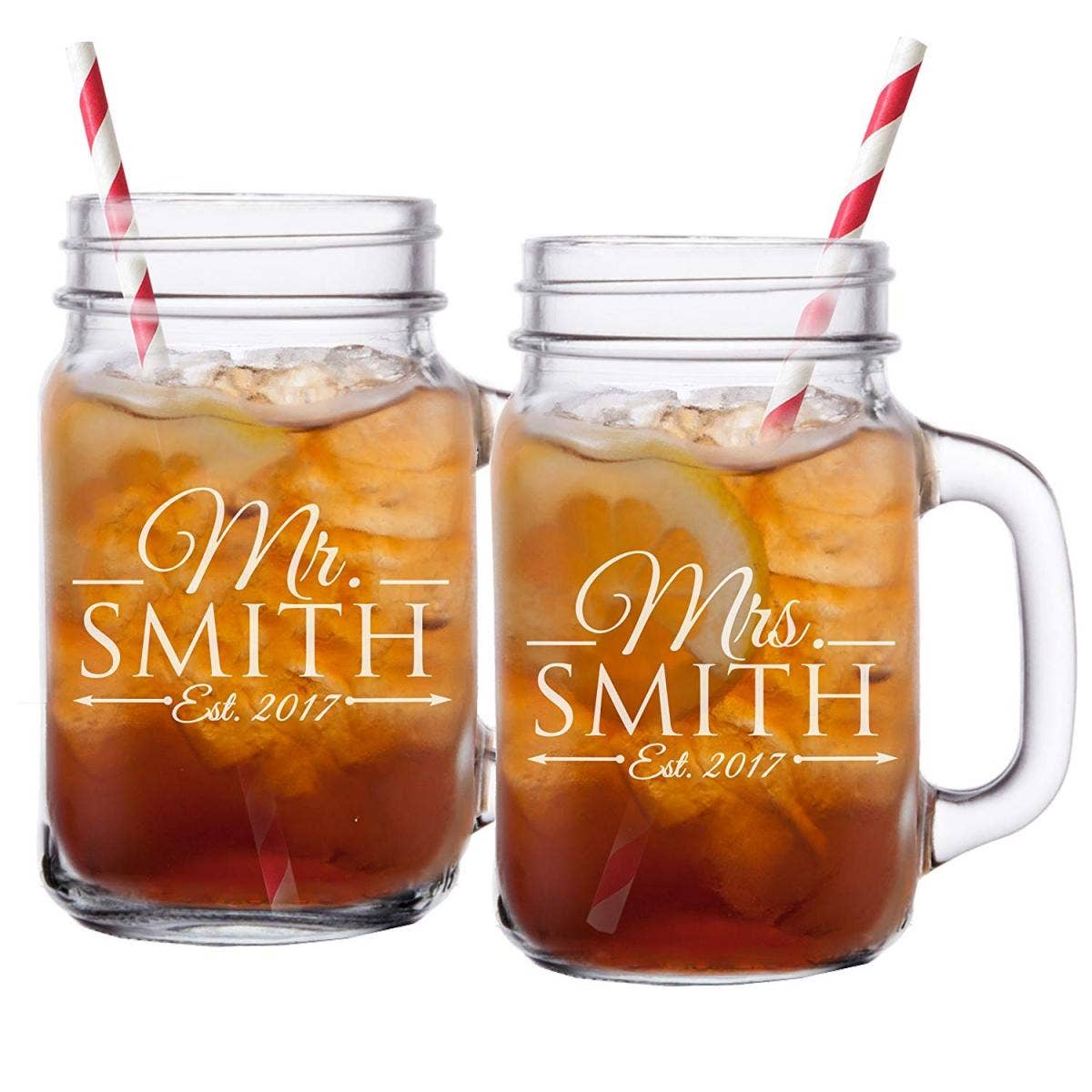 These MR and MRS matching Mason Jar Glasses are the ideal gift for any newlywed couple. This set is available to customize with 6 unique style choices with any name or date, making this matching set a perfect gift.