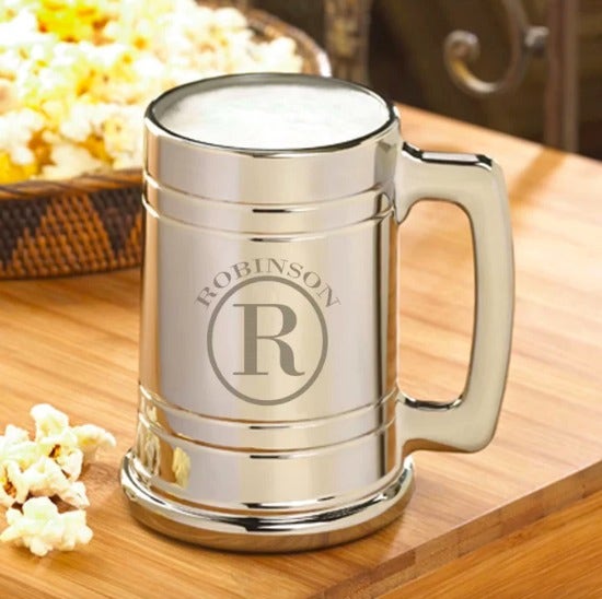Beer drinkers and mug collectors will love this unique metal-coated mug with a personalized monogram. Contemporary but with a classic feel, this personalized mug will hold plenty of your favorite brew and includes a sturdy base, slim handle and sleek lines.