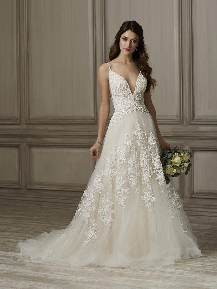 The romantic Jolene has hand-pieced lace appliques throughout her bodice which features a plunging V-neckline. The graceful A-line tulle skirt created from layers of tulle and exquisite lace is complete with a sweeping train for a dreamy look. Jolene reinterprets classic fairy tale styles for a contemporary bride.