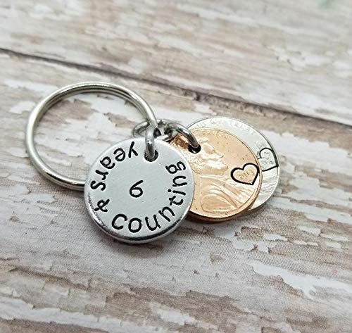 Perfect for an iron anniversary, this keychain is hand stamped with "6 years & counting" on the aluminum layer, and a heart around the year of your marriage on the nickel and penny.