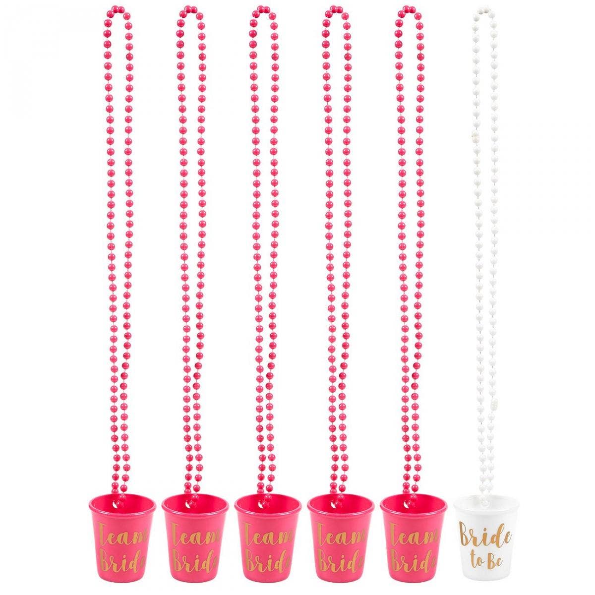 This set of 6 shot glass necklace decorations come with 5 pink "Team Bride" shot glasses and 1 white "Bride to Be" shot glass.