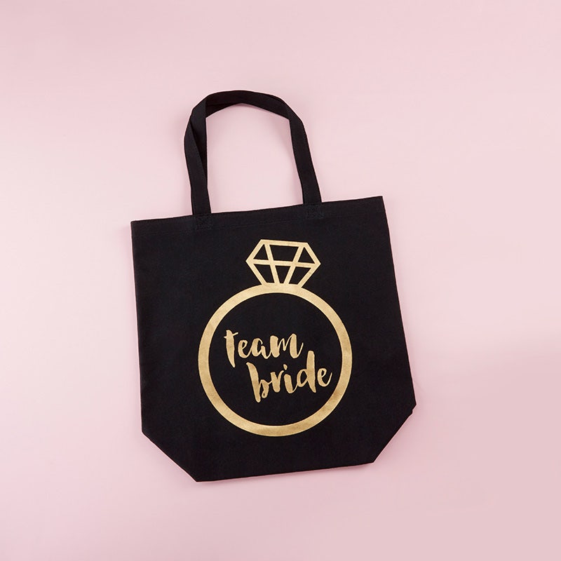 “Team Bride” has become the de facto way of saying you’re in the bridal party, and it’s a phrase that’s easily found on tees, tanks, and even shorts. If you’re going for a bridesmaid gift set that has this phrase as a theme, it’s a good idea to keep that theme going with a sassy, classy tote.