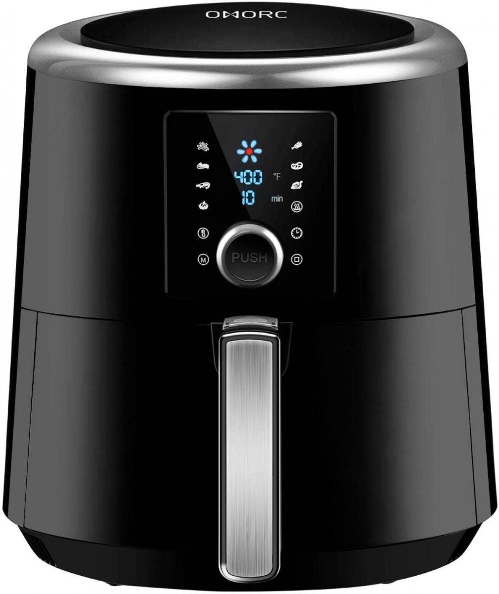 To expand the space, OMORC 6 quart Air Fryer Nonstick Basket has a square design. It can fit a 5-6 pounds, a whole chicken, and has a dishwasher safe basket, perfect for easy cleaning.