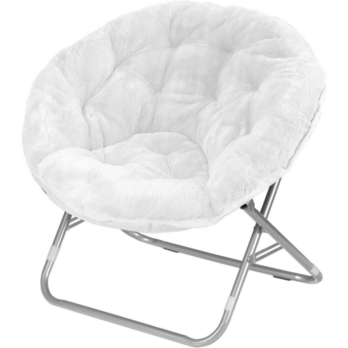The Mainstays saucer chair's cushion is made from durable, plush, 100 percent polyester upholstery. The faux-fur material is soft and cuddly to the touch. A foldable steel frame supports up to 225 pounds and folds flat when not in use, making it easy to hide.