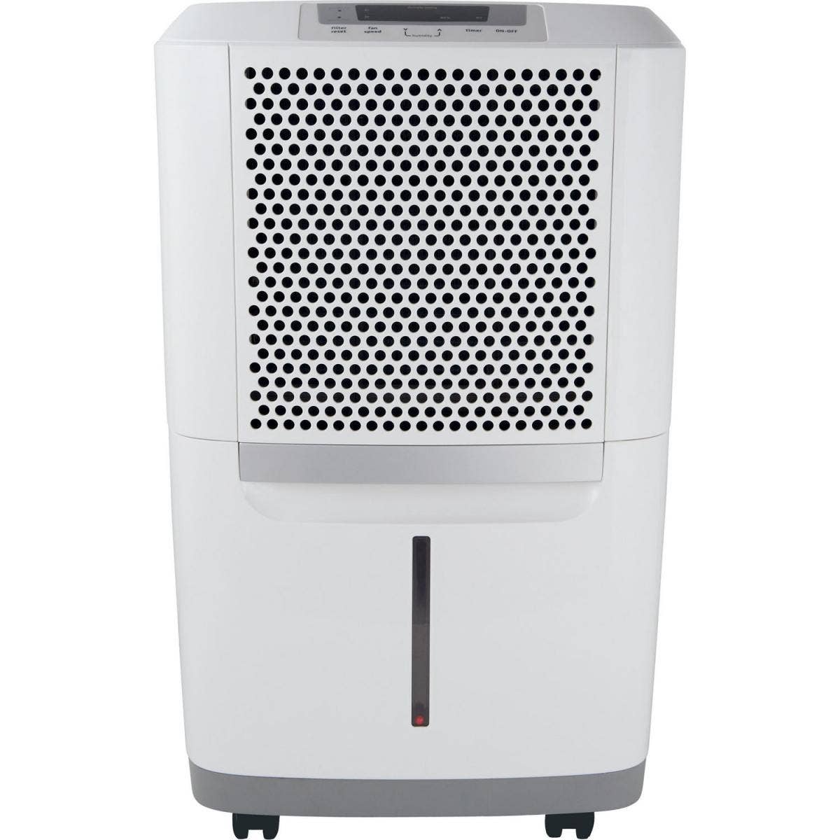 It removes 50 pints of moisture per day and is capable of continuous operation when the unit is located near a suitable drain. This white dehumidifier has easy-to-read electronic controls, a removable air filter, two fan speeds, automatic defrost control, and castors for easy portability.